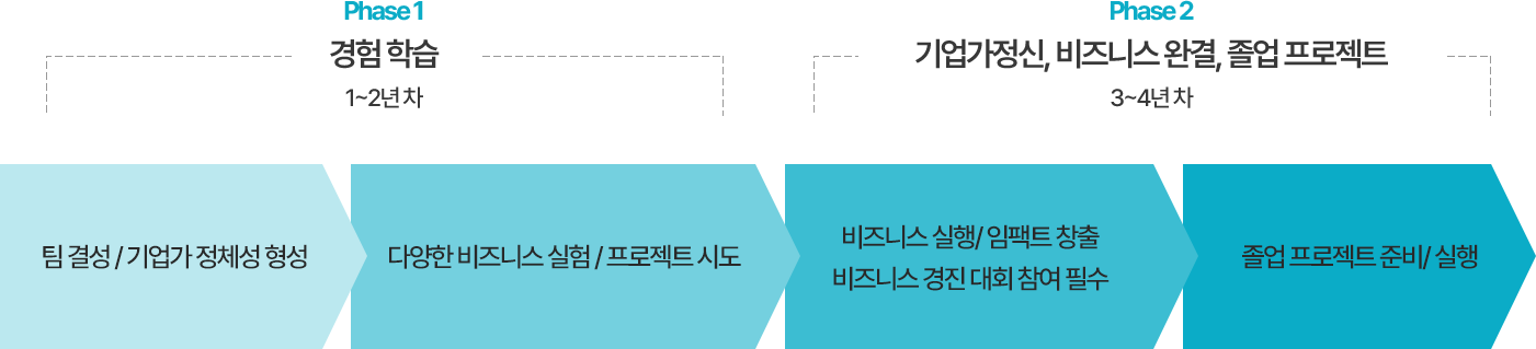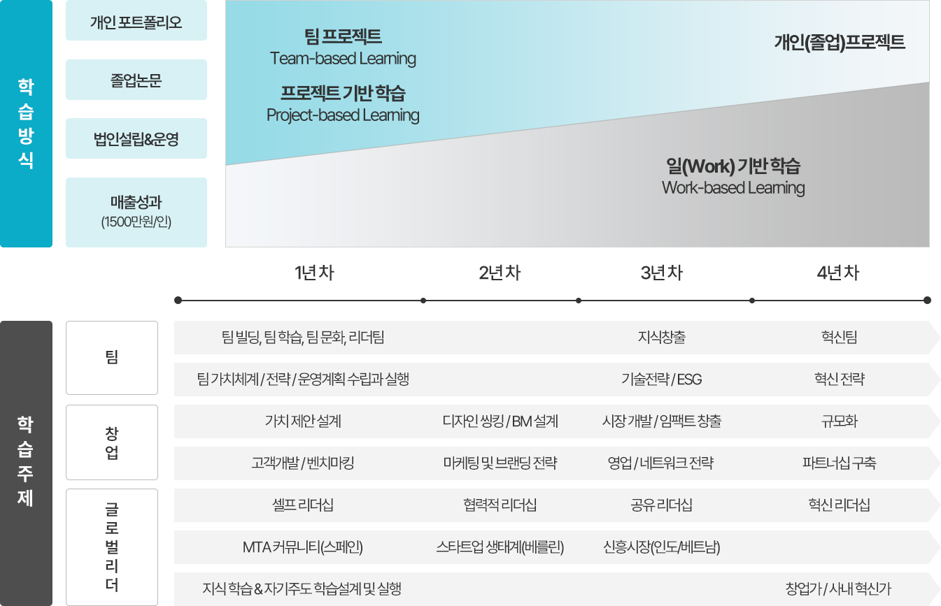 ➀ 1년에 60학점(ECTS), 4년간 총 240학점(ECTS) 취득 (유럽공식 학사 학위 기준) ➁ 3학년까지 1인당 매출 1500만원, 팀 인원수만큼 팀 매출 달성