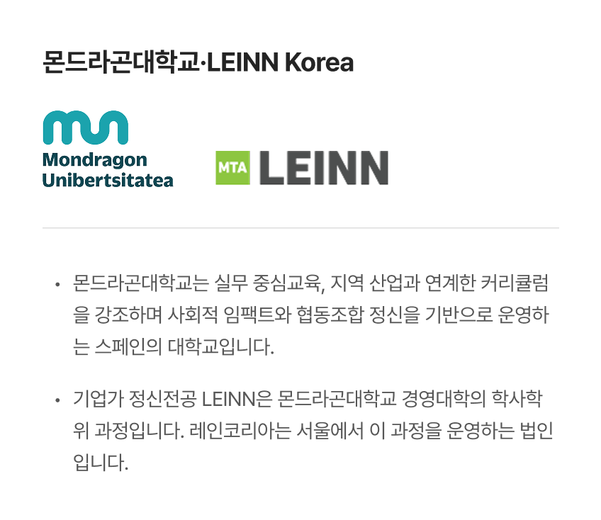 | 몬드라곤대학교 | LEINN의 차별성 | 재학생 이야기 | 입학과정 | 공지사항 |